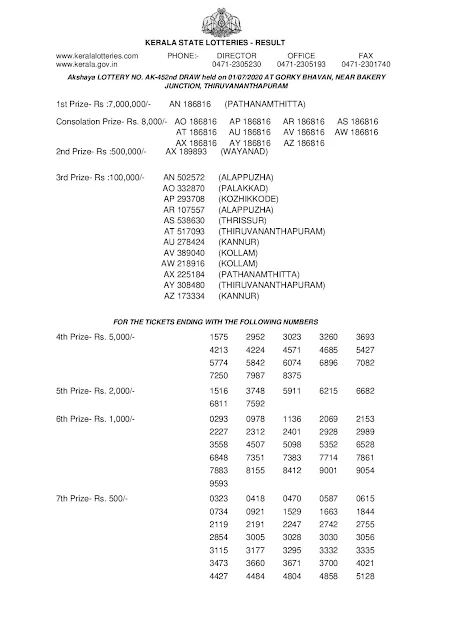 Kerala Lottery winning number AK-452 and 1/7/2020 Kerala lottery today draw list. If the prize money is less than Rs 5,000, the winners can claim the money from any lottery shop in Kerala. If the amount won is above Rs 5,000, the winners will have to surrender their tickets before a bank or government lottery office with id proofs. The prize winners are advised to verify the winning numbers with the results published in the Kerala Government Gazatte and surrender the winning tickets within 30 days.