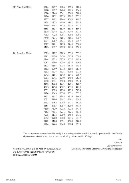 16-10-2020 Friday Kerala Official Lottery Results
